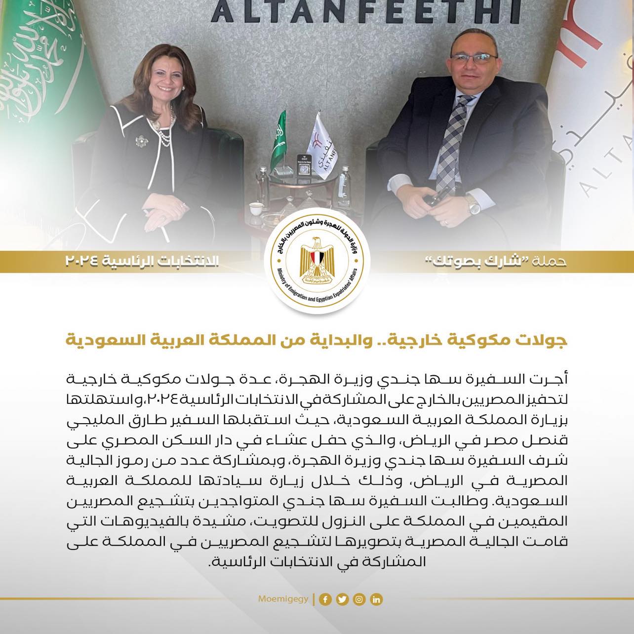 أجرت السفيرة سها جندي وزيرة الهجرة، عدة جولات مكوكية خارجية لتحفيز المصريين بالخارج على المشاركة في الانتخابات الرئاسية 2024، واستهلتها بزيارة المملكة العربية السعودية، حيث استقبلها السفير طارق المليجي قنصل مصر في الرياض، والذي حفل عشاء في دار السكن المصري على شرف السفيرة سها جندي وزيرة الهجرة، وبمشاركة عدد من رموز الجالية المصرية في الرياض، وذلك خلال زيارة سيادتها للمملكة العربية السعودية. وطالبت السفيرة سها جندي المتواجدين في حفل العشاء بتشجيع المصريين المقيمين في المملكة على النزول للتصويت، مشيرة إلى أن الهيئة الوطنية للانتخابات حددت انتخابات المصريين بالخارج أيام الإجازات الرسمية فلابد من مشاركة الجميع وبكثافة أيام 1 و2 و3 ديسمبر الجاري، مشيدة سيادتها بالفيديوهات التي قامت الجالية المصرية بتصويرها لتشجيع المصريين في المملكة على المشاركة في الانتخابات الرئاسية، خاصة أن هذه الفيديوهات تتميز بأنها قصيرة وموجزة ورسالتها مباشرة وواضحة.