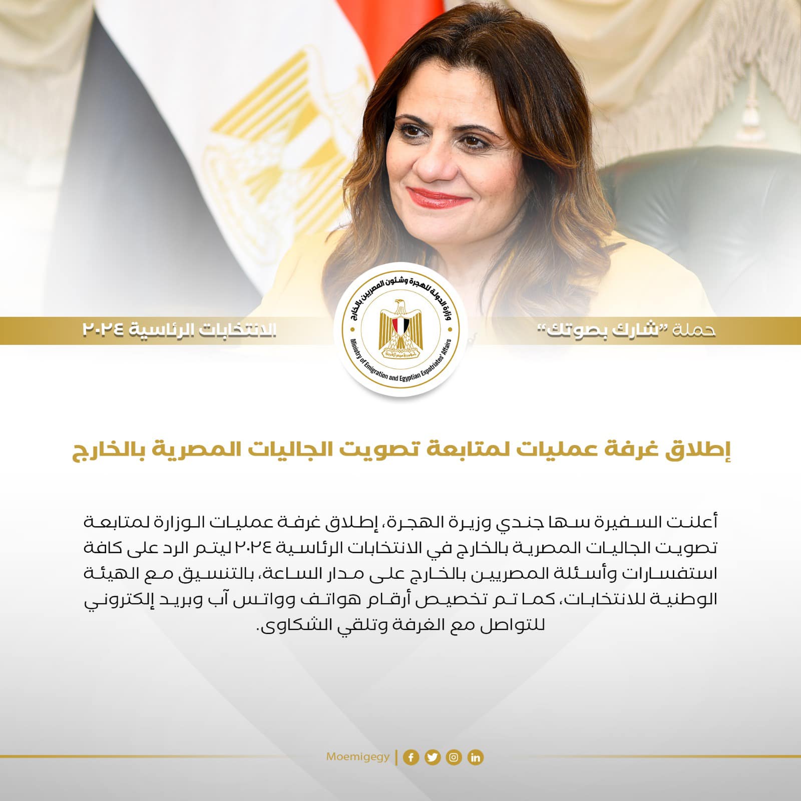 أعلنت السفيرة سها جندي وزيرة الهجرة، إطلاق غرفة عمليات الوزارة لمتابعة تصويت الجاليات المصرية بالخارج في الانتخابات الرئاسية 2024 ليتم الرد على كافة استفسارات وأسئلة المصريين بالخارج على مدار الساعة، بالتنسيق مع الهيئة الوطنية للانتخابات، كما تم تخصيص أرقام هواتف وواتس آب وبريد إلكتروني للتواصل مع الغرفة وتلقي الشكاوى.