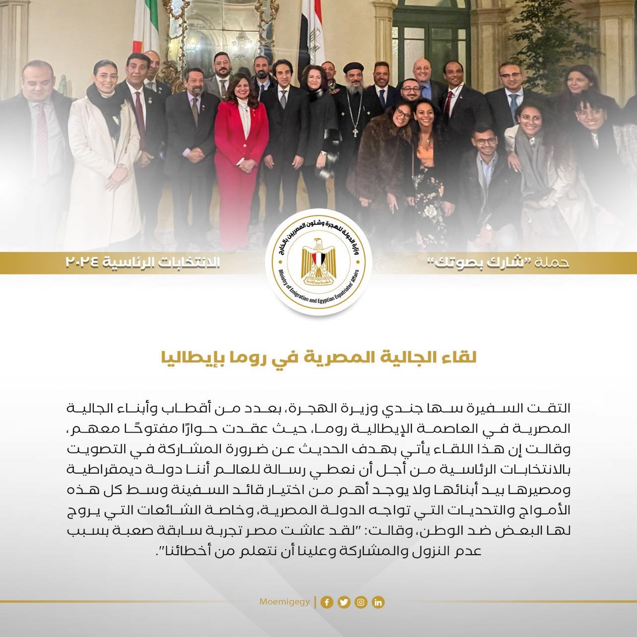 التقت السفيرة سها جندي وزيرة الهجرة، بعدد من أقطاب وأبناء الجالية المصرية في العاصمة الإيطالية روما، حيث عقدت حوارًا مفتوحًا معهم، وقالت إن هذا اللقاء يأتي بهدف الحديث عن ضرورة المشاركة في التصويت بالانتخابات الرئاسية من أجل أن نعطي رسالة للعالم أننا دولة ديمقراطية ومصيرها بيد أبنائها ولا يوجد أهم من اختيار قائد السفينة وسط كل هذه الأمواج والتحديات التي تواجه الدولة المصرية، وخاصة الشائعات التي يروج لها البعض ضد الوطن، وقالت: “لقد عاشت مصر تجربة سابقة صعبة بسبب عدم النزول والمشاركة وعلينا أن نتعلم من أخطائنا”.