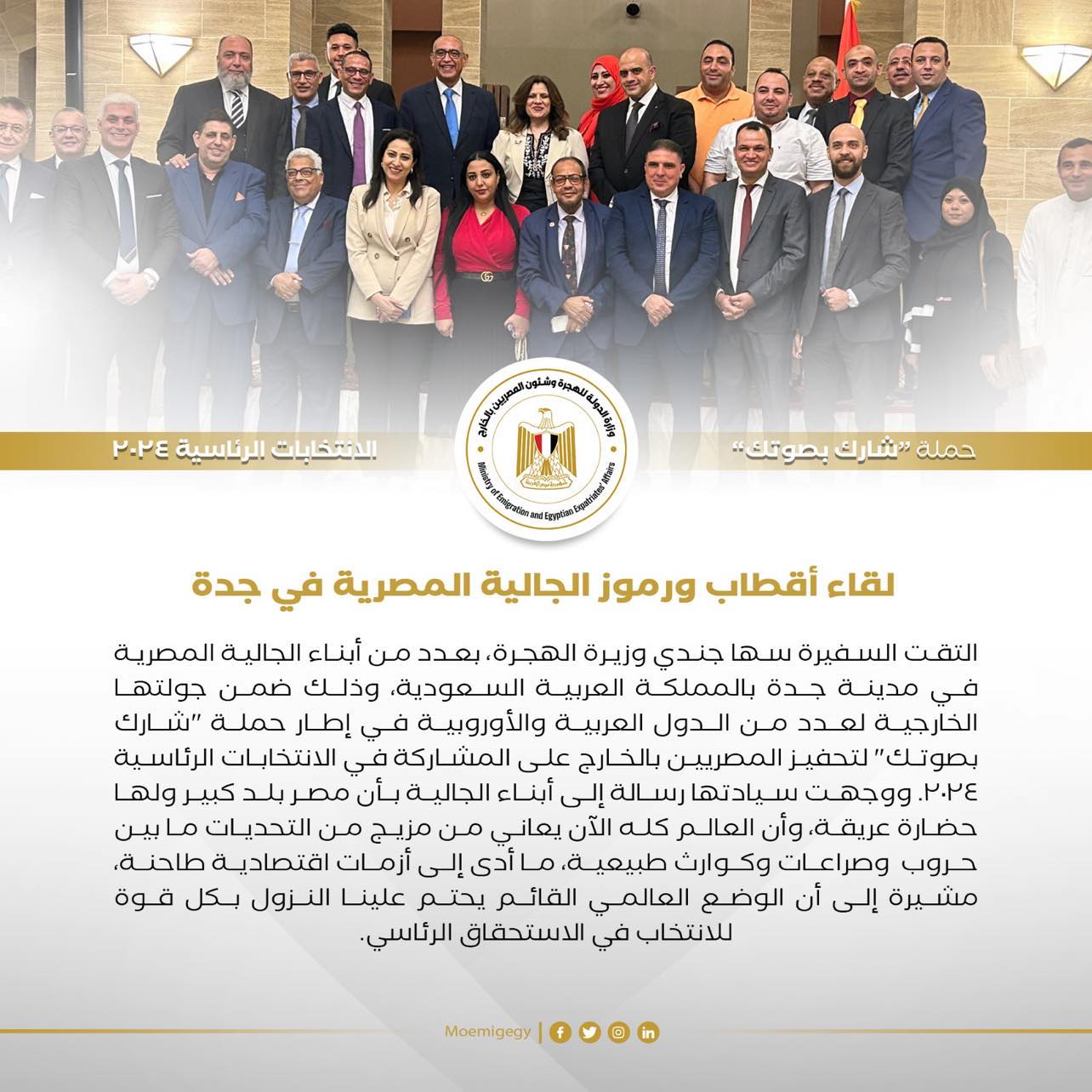 التقت السفيرة سها جندي وزيرة الهجرة، بعدد من أبناء الجالية المصرية في مدينة جدة بالمملكة العربية السعودية، وذلك ضمن جولتها الخارجية لعدد من الدول العربية والأوروبية في إطار حملة “شارك بصوتك” لتحفيز المصريين بالخارج على المشاركة في الانتخابات الرئاسية 2024. ووجهت سيادتها رسالة إلى أبناء الجالية بأن مصر بلد كبير ولها حضارة عريقة، وأن العالم كله الآن يعاني من مزيج من التحديات ما بين حروب وصراعات وكوارث طبيعية، ما أدى إلى أزمات اقتصادية طاحنة، مشيرة إلى أن الوضع العالمي القائم يحتم علينا النزول بكل قوة للانتخاب في الاستحقاق الرئاسي.