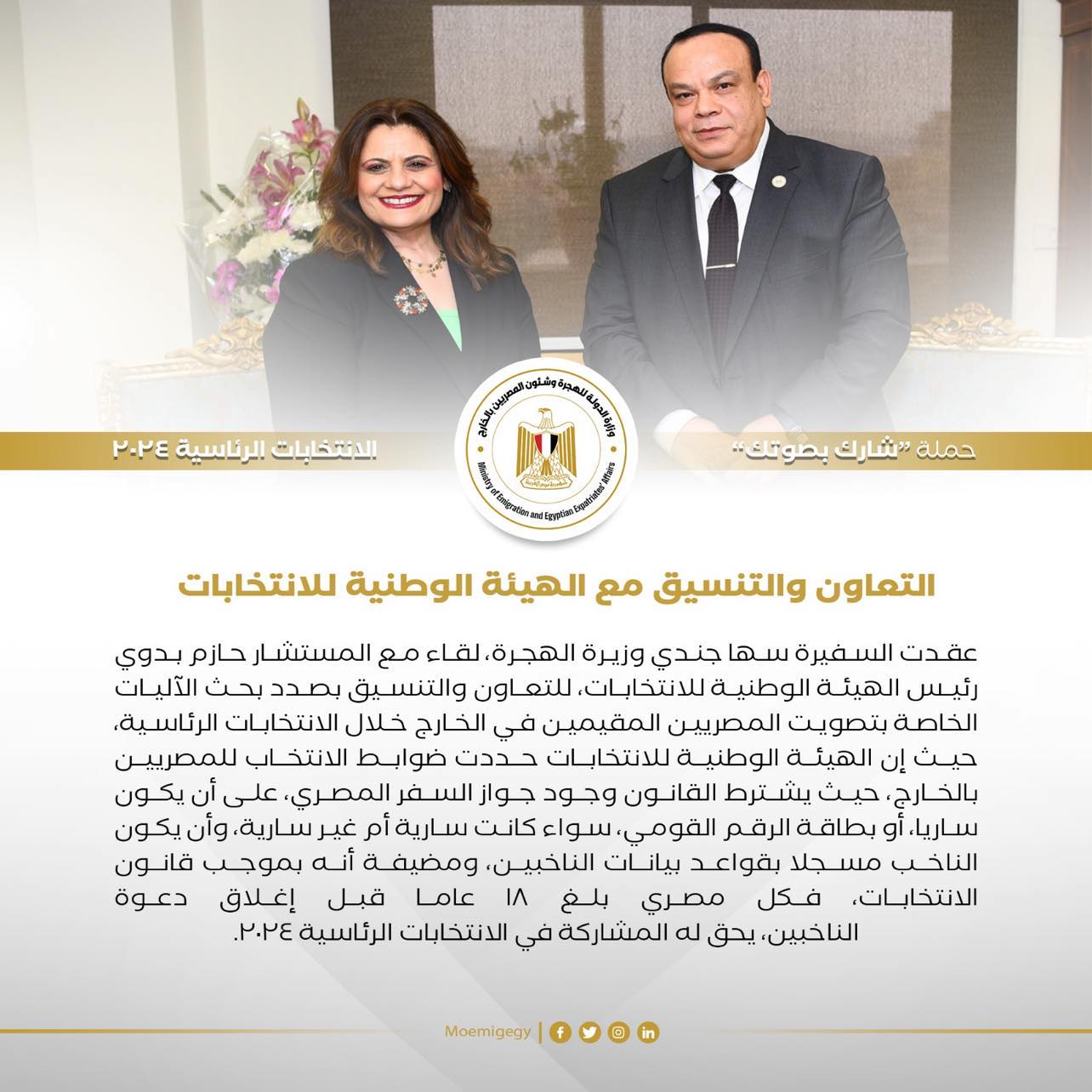 عقدت السفيرة سها جندي وزيرة الهجرة، لقاء مع المستشار حازم بدوي رئيس الهيئة الوطنية للانتخابات، للتعاون والتنسيق بصدد بحث الآليات الخاصة بتصويت المصريين المقيمين في الخارج خلال الانتخابات الرئاسية، حيث إن الهيئة الوطنية للانتخابات حددت ضوابط الانتخاب للمصريين بالخارج، حيث يشترط القانون وجود جواز السفر المصري، على أن يكون ساريا، أو بطاقة الرقم القومي، سواء كانت سارية أم غير سارية، وأن يكون الناخب مسجلا بقواعد بيانات الناخبين، ومضيفة أنه بموجب قانون الانتخابات، فكل مصري بلغ 18 عاما قبل إغلاق دعوة الناخبين، يحق له المشاركة في الانتخابات الرئاسية 2024.