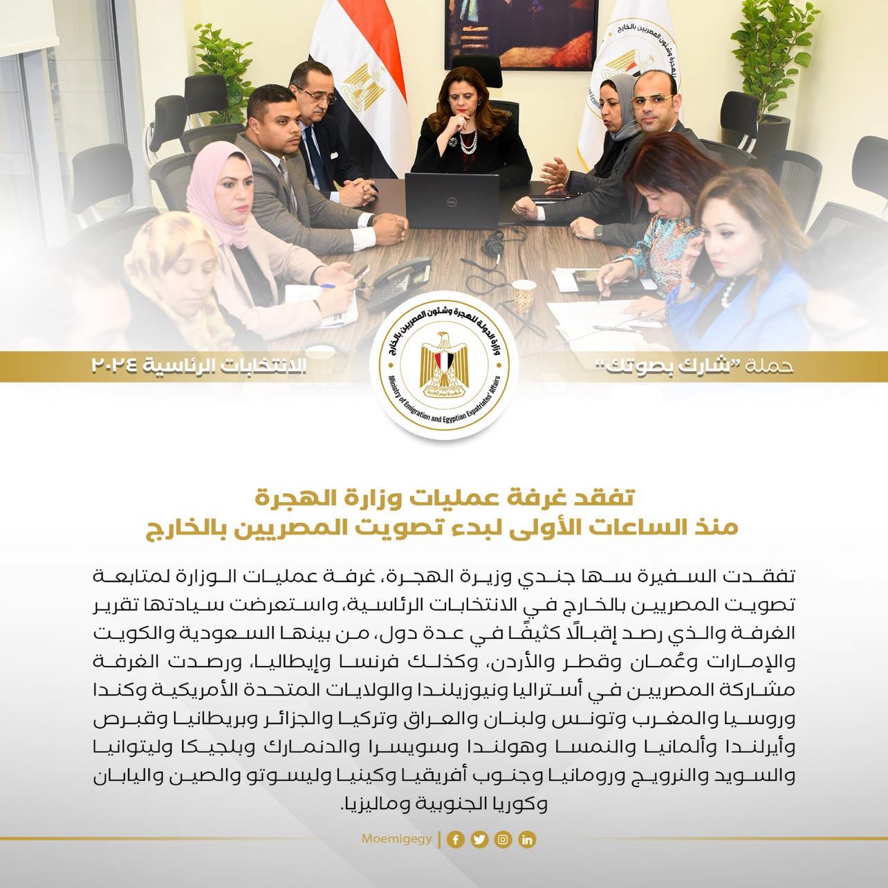 تفقدت السفيرة سها جندي وزيرة الهجرة، غرفة عمليات وزارة الهجرة المخصصة لمتابعة تصويت المصريين بالخارج في الانتخابات الرئاسية بالتعاون والتنسيق مع وزارة الخارجية والهيئة الوطنية للانتخابات، كما استعرضت سيادتها تقرير الغرفة والذي رصد إقبالًا كثيفًا في عدد كبير من الدول حول العالم، من بينها السعودية والكويت والإمارات وعُمان وقطر والأردن، وكذلك فرنسا وإيطاليا بالرغم من أن الجمعة كان يوم عمل رسمي لديهم، فيما رصدت الغرفة مشاركة المصريين في أستراليا ونيوزيلندا والولايات المتحدة الأمريكية وكندا وروسيا والمغرب وتونس ولبنان والعراق وتركيا والجزائر وبريطانيا وقبرص وأيرلندا وألمانيا والنمسا وهولندا وسويسرا والدنمارك وبلجيكا وليتوانيا والسويد والنرويج ورومانيا وجنوب أفريقيا وكينيا وليسوتو والصين واليابان وكوريا الجنوبية وماليزيا.