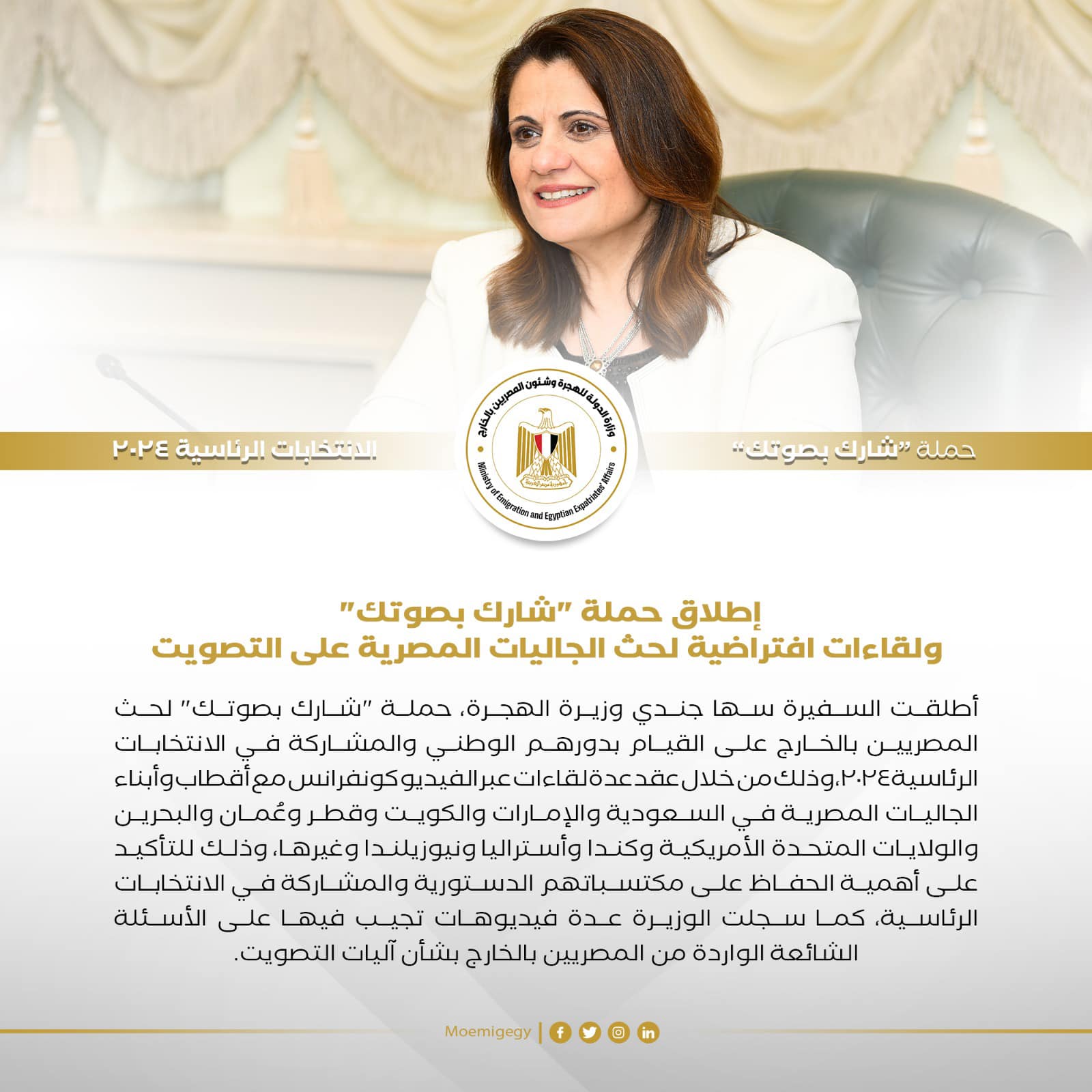 أطلقت السفيرة سها جندي وزيرة الهجرة، حملة “شارك بصوتك” لحث المصريين بالخارج على القيام بدورهم الوطني والمشاركة في الانتخابات الرئاسية 2024، وذلك من خلال عقد عدة لقاءات عبر الفيديو كونفرانس مع أقطاب وأبناء الجاليات المصرية في السعودية والإمارات والكويت وقطر وعُمان والبحرين والولايات المتحدة الأمريكية وكندا وأستراليا ونيوزيلندا وغيرها، وذلك للتأكيد على أهمية الحفاظ على مكتسباتهم الدستورية والمشاركة في الانتخابات الرئاسية، كما سجلت الوزيرة عدة فيديوهات تجيب فيها على الأسئلة الشائعة الواردة من المصريين بالخارج بشأن آليات التصويت.