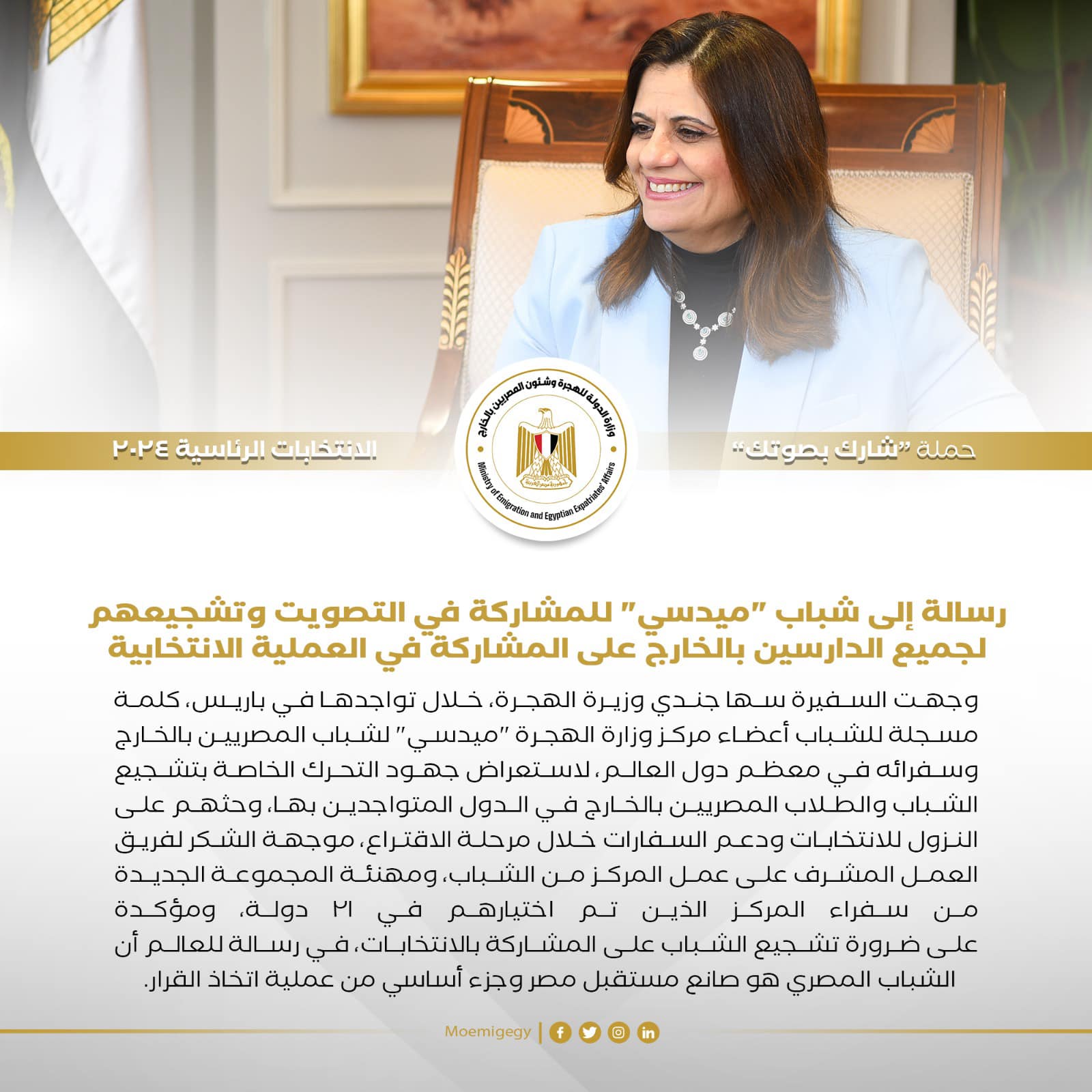 وجهت السفيرة سها جندي وزيرة الهجرة، خلال تواجدها في باريس، كلمة مسجلة للشباب أعضاء مركز وزارة الهجرة “ميدسي” لشباب المصريين بالخارج وسفرائه في معظم دول العالم، لاستعراض جهود التحرك الخاصة بتشجيع الشباب والطلاب المصريين بالخارج في الدول المتواجدين بها، وحثهم على النزول للانتخابات ودعم السفارات خلال مرحلة الاقتراع، موجهة الشكر لفريق العمل المشرف على عمل المركز من الشباب، ومهنئة المجموعة الجديدة من سفراء المركز الذين تم اختيارهم في ٢١ دولة، ومؤكدة على ضرورة تشجيع الشباب على المشاركة بالانتخابات، في رسالة للعالم أن الشباب المصري هو صانع مستقبل مصر وجزء أساسي من عملية اتخاذ القرار.