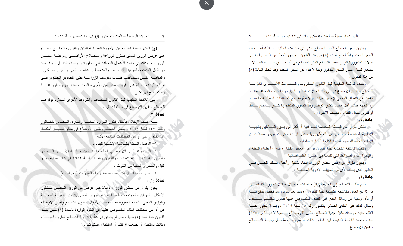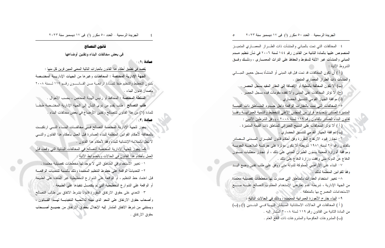 أصدر الرئيس عبدالفتاح السيسي، رئيس الجمهورية، قرارا جمهوريا بإصدار القانون رقم 187 لسنة 2023، بشأن قانون التصالح في بعض مخالفات البناء وتقنين أوضاعها.