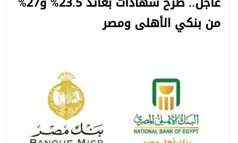 طرح بنكا الأهلي ومصر، شهادتي ادخار، بعائد 23.5% شهريًا، و27% سنويًّا، لمدة عام واحد، مع بدء طرح الشهادين أون لاين، بداية من غد الجمعة، وفقا لمصادر مسؤولة.طرح شهادات بعائد 23%وقالت مصادر حكومية للقاهرة 24، إن بنكي الأهلي ومصر، طرحا شهادة ادخار بعائد 23.5%، لمدة عام واحد، مع صرف عائدها شهريا.وتابعت المصادر، أن البنكين طرحا شهادة ادخار أخرى بعائد 27%، يصرف سنويا، موضحا أن عمليات الشراء أون لاين تبدأ غدا الجمعة، مع إمكانية شراء الشهادات من فروع البنوك الاثنين المقبل.
