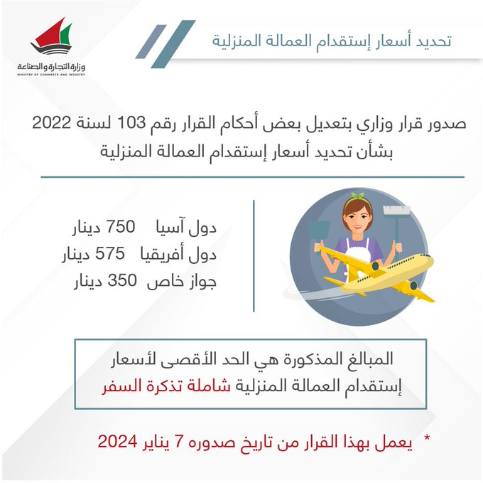 أصدرت وزارة التجارة والصناعة الكويتية قرارا وزاريا بتعديل بعض أحكام القرار رقم 103 لسنة 2022 بشأن تحديد أسعار استقدام العمالة المنزلية، حيث بدأ العمل بقرار الأسعار الجديدة لاستقدام العمالة المنزلية بداية من يوم أمس الأحد 7 يناير 2024.