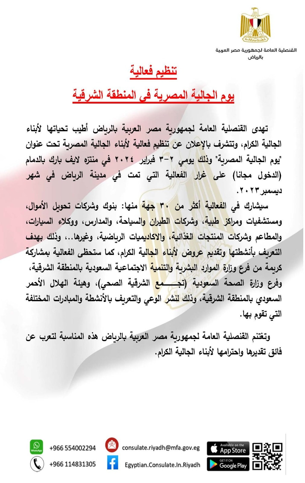 تهدى القنصلية العامة لجمهورية مصر العربية بالرياض أطيب تحياتها لأبناء الجالية الكرام، وتتشرف بالإعلان عن تنظيم فعالية لأبناء الجالية المصرية تحت عنوان يوم الجالية المصرية” وذلك يومي ۲-۳ فبراير ۲۰۲٤ في منتر لايف بارك بالدمام الدخول مجانا على غرار الفعالية التي تمت في مدينة الرياض في شهر