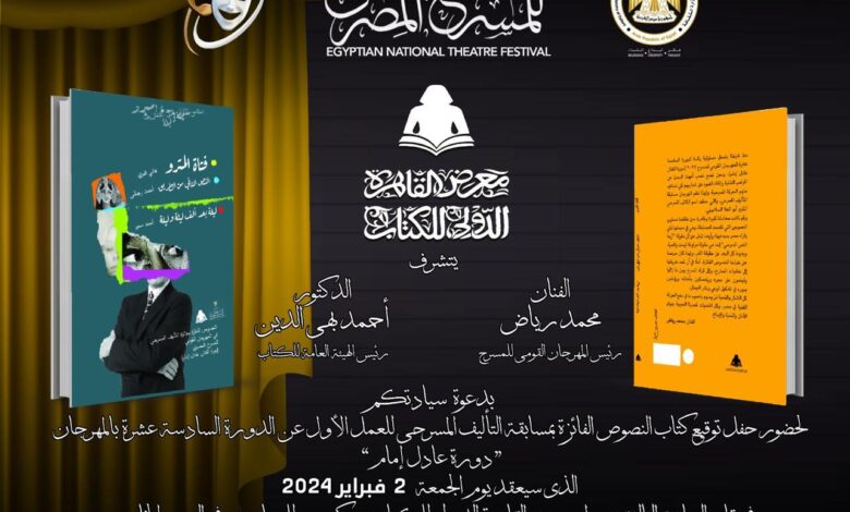 يحتفي مهرجان المسرح المصري بالفائزين بـ “مسابقة العمل الأول في التأليف المسرحي” بمعرض القاهرة الدولي للكتاب بحضور : النجم محمد رياضالفنان ياسر صادق الدكتور أحمد بهي الدينالدكتور الفنان أيمن عبد الرحمن وأعضاء اللجنة العليا بالكامل ورؤساء وأعضاء اللجان المختلفة