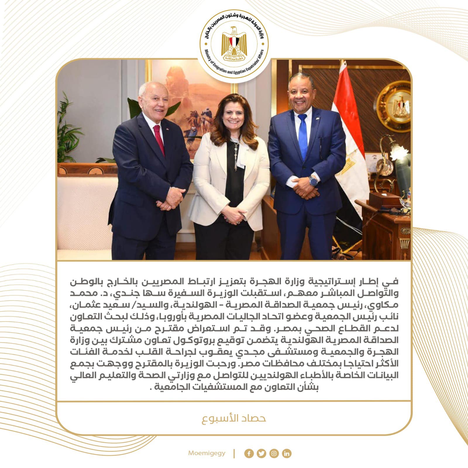 1- في إطار إستراتيجية وزارة الهجرة بتعزيز ارتباط المصريين بالخارج بالوطن والتواصل المباشر معهم، استقبلت الوزيرة السفيرة سها جندي، د. محمد مكاوي، رئيس جمعية الصداقة المصرية – الهولندية، والسيد/ سعيد عثمان، نائب رئيس الجمعية وعضو اتحاد الجاليات المصرية بأوروبا، وذلك لبحث التعاون لدعم القطاع الصحي بمصر. وقد تم استعراض مقترح من رئيس جمعية الصداقة المصرية الهولندية يتضمن توقيع بروتوكول تعاون مشترك بين وزارة الهجرة والجمعية ومستشفى مجدي يعقوب لجراحة القلب لخدمة الفئات الأكثر احتياجا بمختلف محافظات مصر. ورحبت الوزيرة بالمقترح موجهة بجمع البيانات الخاصة بالأطباء الهولنديين للتواصل مع وزارتي الصحة والتعليم العالي بشأن التعاون مع المستشفيات الجامعية لاستخراج التصاريح اللازمة لهم، ووضع آلية للتعاون من أجل المساهمة في تقديم الخدمات الصحية المختلفة للفئات الأكثر احتياجًا.