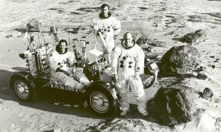 ويظهر في الصورة ثلاثة رواد فضاء من دون خوذة، في طبيعة صخريّة تشبه طبيعة سطح القمر.