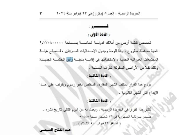 أصدر الرئيس عبد الفتاح السيسي القرار رقم 55 لسنة 2024، والذي نصت المادة الأولى منه على «تخصص قطعة أرض من أملاك الدولة الخاصة بمساحة 170 مليونا و800 ألف متر مربع ناحية محافظة مطروح وفقا للوحة وجدول الإحداثيات المرفقين لصالح هيئة المجتمعات العمرانية الجديدة، لاستخدامها في إقامة مدينة رأس الحكمة الجديدة، وذلك نقلا من الأراضي المملوكة للقوات المسلحة».