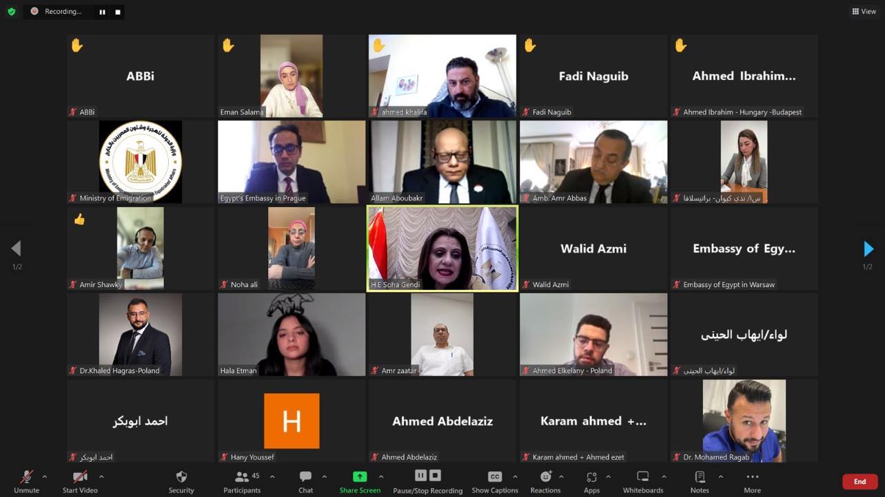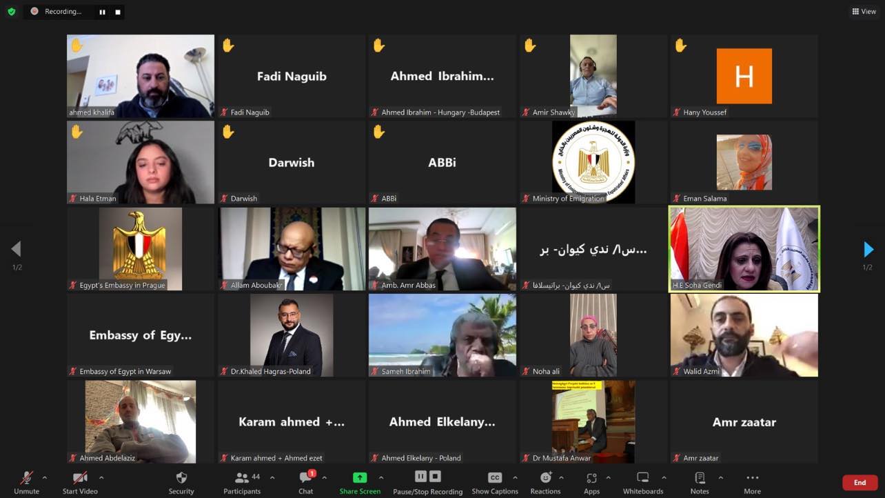 في إطار مبادرة «ساعة مع الوزيرة».. وزيرة الهجرة تعقد لقاء مع أعضاء ورموز الجاليات المصرية في المجر وبولندا والتشيك وسلوفاكيا