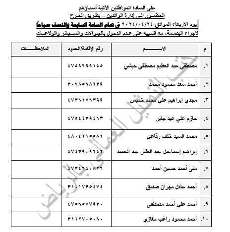 أعلن مكتب التمثيل العمالي في الرياض عن كشف يأسماء وافدين مصريين عليهم الحضور للمكتب لإجراء البصمة يوم الأربعاء 24 أبريل 2025 في تمام السابعة ونصف صباحا