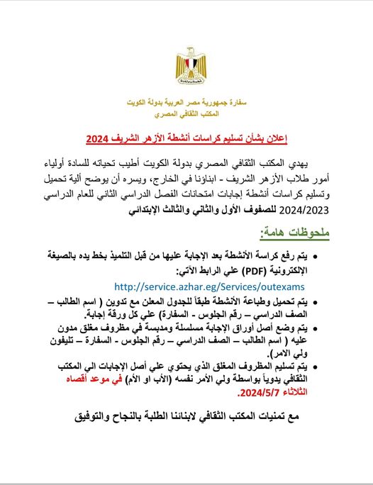 أعلن المكتب الثفافي اللمصري في الكويت عن آلية تحميل كراسات أنشطة إجابات امتحانات الفصل الدراسي الثاني للعام الدراسي 2023- 2024 وفقا للخطوات المعلنة
