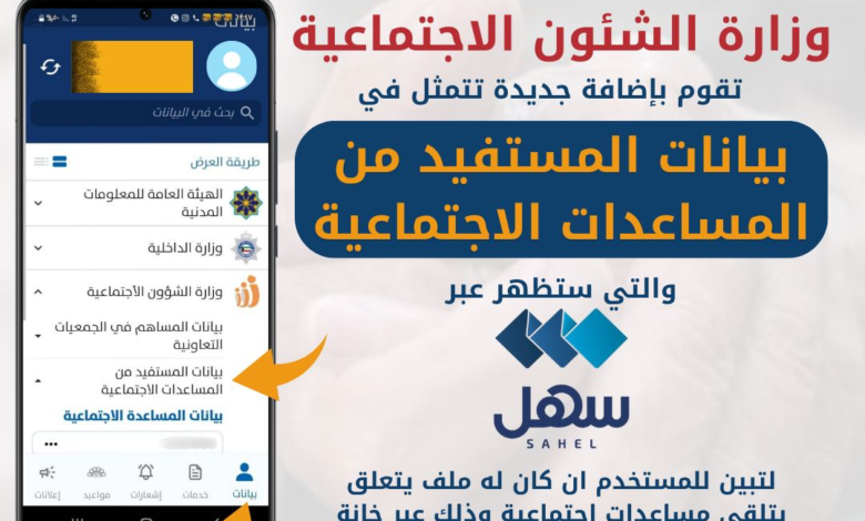 لتبين للمستخدم إن كان له ملف يتعلق بتلقي مساعدات اجتماعية وذلك عبر خانة الوزارة في قائمة (بيانات) داخل سهل