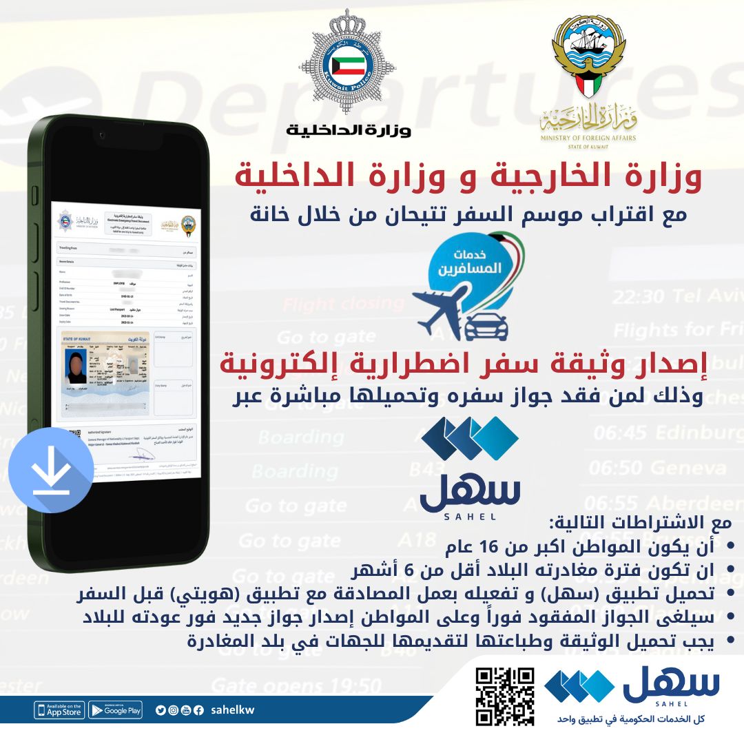 تقدم وزارة الخارجية الكويتية بالتعاون مع وزارة الداخلية خدمة إصدار وثيقة سفر اضطرارية عبر خانة (خدمات المسافرين) في قائمة (خدمات) داخل تطبيق سهل.