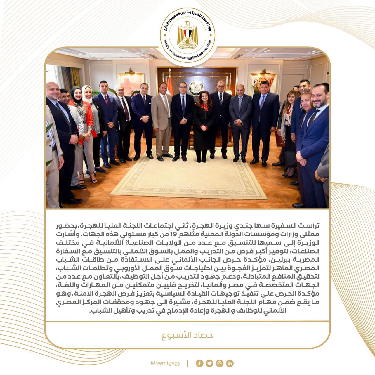 1- ترأست السفيرة سها جندي وزيرة الهجرة، ثاني اجتماعات اللجنة العليا للهجرة، بحضور ممثلي وزارات ومؤسسات الدولة المعنية مثّلهم 19 من كبار مسئولي هذه الجهات. وأشارت الوزيرة إلى سعيها للتنسيق مع عدد من الولايات الصناعية الألمانية في مختلف الصناعات، لتوفير أكبر فرص من التدريب والعمل بالسوق الألماني بالتنسيق مع السفارة المصرية ببرلين، مؤكدة حرص الجانب الألماني على الاستفادة من طاقات الشباب المصري الماهر لتعزيز الفجوة بين احتياجات سوق العمل الأوروبي وتطلعات الشباب، لتحقيق المنافع المتبادلة، ودعم جهود التدريب من أجل التوظيف، بالتعاون مع عدد من الجهات المتخصصة في مصر وألمانيا، لتخريج فنيين متمكنين من المهارات واللغة، مؤكدة الحرص على تنفيذ توجيهات القيادة السياسية بتعزيز فرص الهجرة الآمنة، وهو ما يقع ضمن مهام اللجنة العليا للهجرة، مشيرة إلى جهود ومحققات المركز المصري الألماني للوظائف والهجرة وإعادة الإدماج في تدريب وتأهيل الشباب.