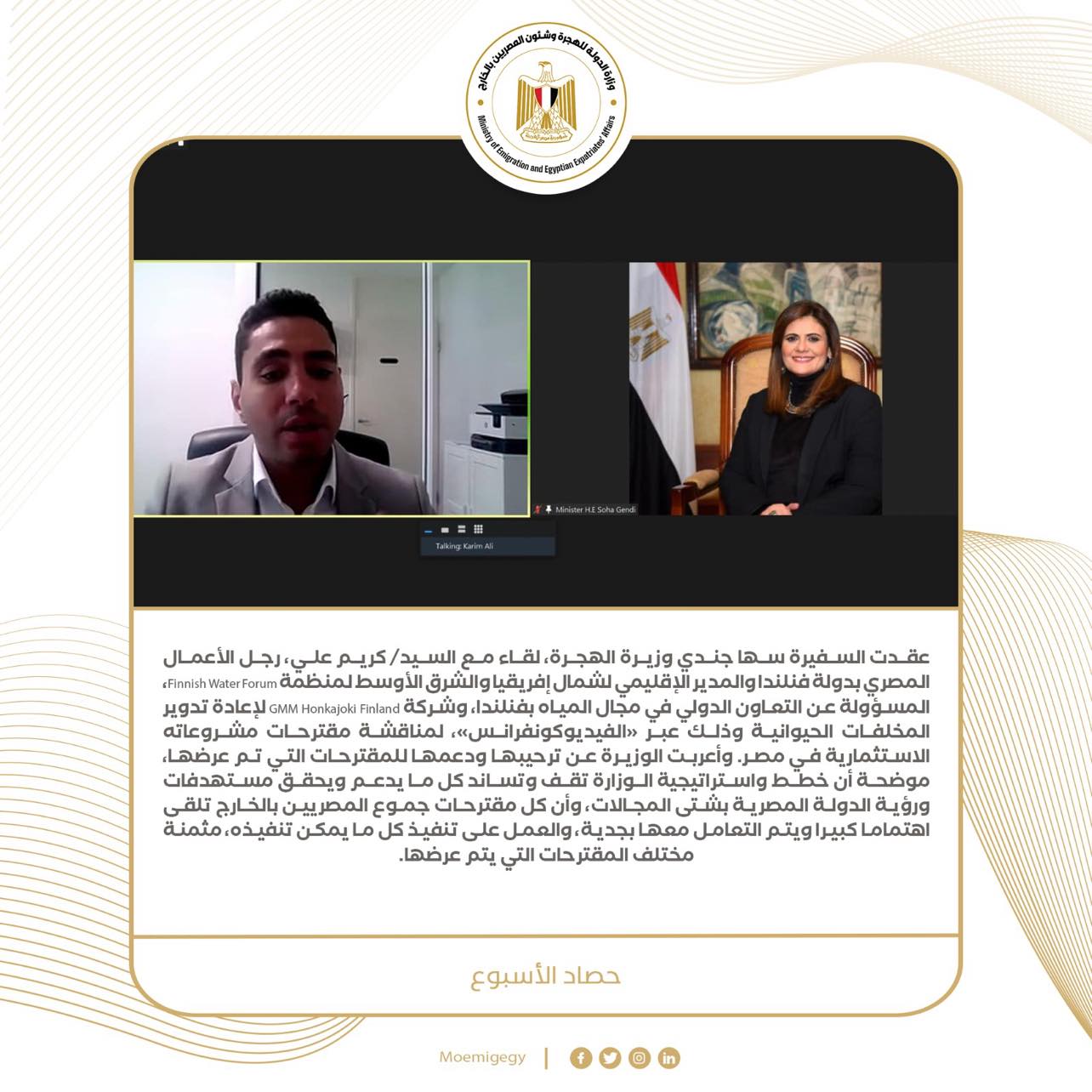 7- عقدت السفيرة سها جندي وزيرة الهجرة، لقاء مع السيد/ كريم علي، رجل الأعمال المصري بدولة فنلندا والمدير الإقليمي لشمال إفريقيا والشرق الأوسط لمنظمة Finnish Water Forum، المسؤولة عن التعاون الدولي في مجال المياه بفنلندا، وشركة GMM Honkajoki Finland لإعادة تدوير المخلفات الحيوانية وذلك عبر «الفيديوكونفرانس»، لمناقشة مقترحات مشروعاته الاستثمارية في مصر. وأعربت الوزيرة عن ترحيبها ودعمها للمقترحات التي تم عرضها، موضحة أن خطط واستراتيجية الوزارة تقف وتساند كل ما يدعم ويحقق مستهدفات ورؤية الدولة المصرية بشتى المجالات، وأن كل مقترحات جموع المصريين بالخارج تلقى اهتماما كبيرا ويتم التعامل معها بجدية، والعمل على تنفيذ كل ما يمكن تنفيذه، مثمنة مختلف المقترحات التي يتم عرضها.