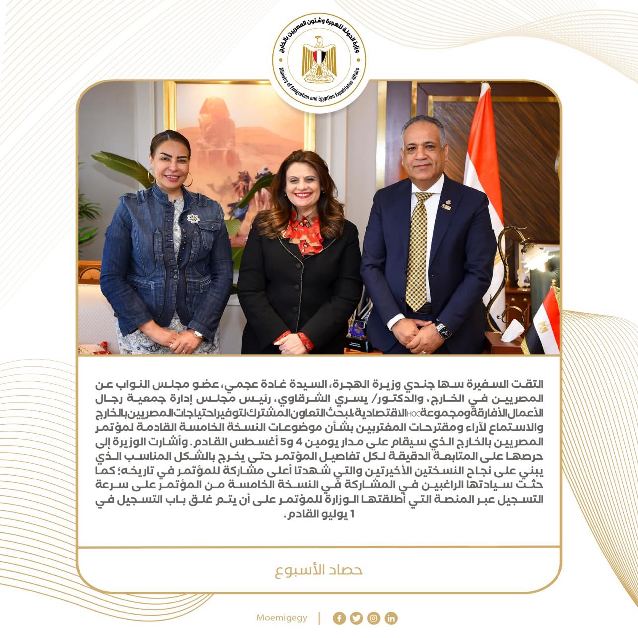 3- التقت السفيرة سها جندي وزيرة الهجرة، السيدة غادة عجمي، عضو مجلس النواب عن المصريين في الخارج، والدكتور/ يسري الشرقاوي، رئيس مجلس إدارة جمعية رجال الأعمال الأفارقة ومجموعة HOC الاقتصادية، لبحث التعاون المشترك لتوفير احتياجات المصريين بالخارج والاستماع لآراء ومقترحات المغتربين بشأن موضوعات النسخة الخامسة القادمة لمؤتمر المصريين بالخارج الذي سيقام على مدار يومين 4 و5 أغسطس القادم. وأشارت الوزيرة إلى حرصها على المتابعة الدقيقة لكل تفاصيل المؤتمر حتى يخرج بالشكل المناسب الذي يبني على نجاح النسختين الأخيرتين والتي شهدتا أعلى مشاركة للمؤتمر في تاريخه؛ كما حثت سيادتها الراغبين في المشاركة في النسخة الخامسة من المؤتمر على سرعة التسجيل عبر المنصة التي أطلقتها الوزارة للمؤتمر على أن يتم غلق باب التسجيل في 1 يوليو القادم.