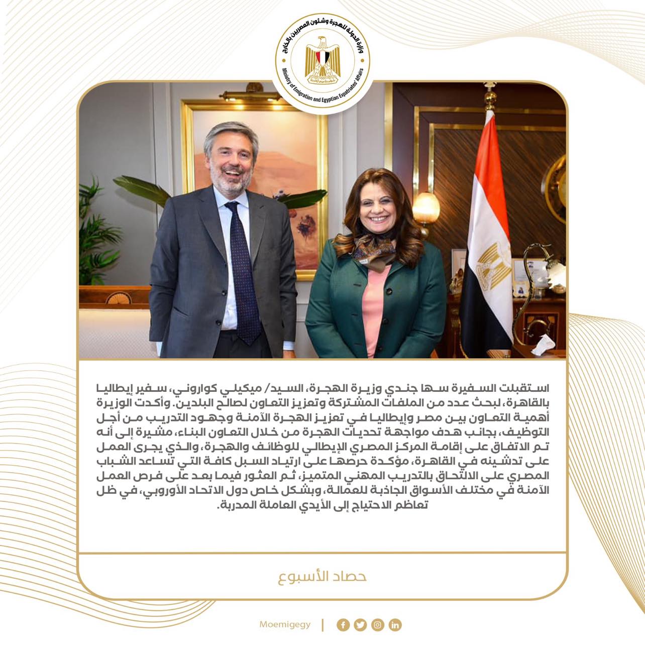 5- استقبلت السفيرة سها جندي وزيرة الهجرة، السيد/ ميكيلي كواروني، سفير إيطاليا بالقاهرة، لبحث عدد من الملفات المشتركة وتعزيز التعاون لصالح البلدين. وأكدت الوزيرة أهمية التعاون بين مصر وإيطاليا في تعزيز الهجرة الآمنة وجهود التدريب من أجل التوظيف، بجانب هدف مواجهة تحديات الهجرة من خلال التعاون البناء، مشيرة إلى أنه تم الاتفاق على إقامة المركز المصري الإيطالي للوظائف والهجرة، والذي يجرى العمل على تدشينه في القاهرة، مؤكدة حرصها على ارتياد السبل كافة التي تساعد الشباب المصري على الالتحاق بالتدريب المهني المتميز، ثم العثور فيما بعد على فرص العمل الآمنة في مختلف الأسواق الجاذبة للعمالة، وبشكل خاص دول الاتحاد الأوروبي، في ظل تعاظم الاحتياج إلى الأيدي العاملة المدربة.