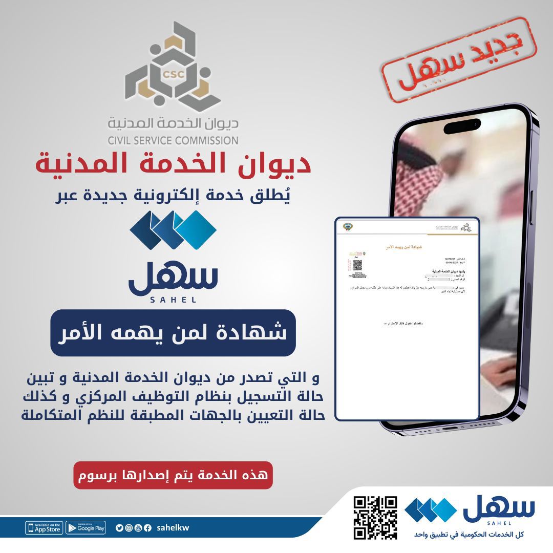 أطلق ديوان الخدمة المدنية يُطلق خدمة إلكترونية جديدة عبر تطبيق سهل وهي (شهادة لمن يهمه الأمر)، و التي تصدر من ديوان الخدمة المدنية وتبين حالة التسجيل بنظام التوظيف المركزي وكذلك حالة التعيين بالجهات المطبقة للنظم المتكاملة