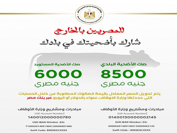 احتفاءً بقرب حلول عيد الأضحى المبارك، وبالتعاون مع وزارة الأوقاف، وانطلاقا من دورها تجاه أبناء مصر في الخارج وتلبية لرغباتهم، سعت وزارة الهجرة، بالتعاون مع وزارة الأوقاف، إلى توفير صكوك أضاحي للجاليات المصرية في الخارج.