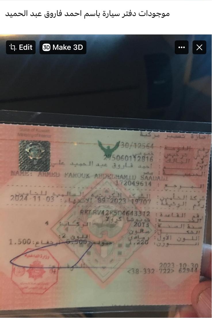 تم العثور على دفتر سيارة باسم أحمد فاروق عبد الحميد على