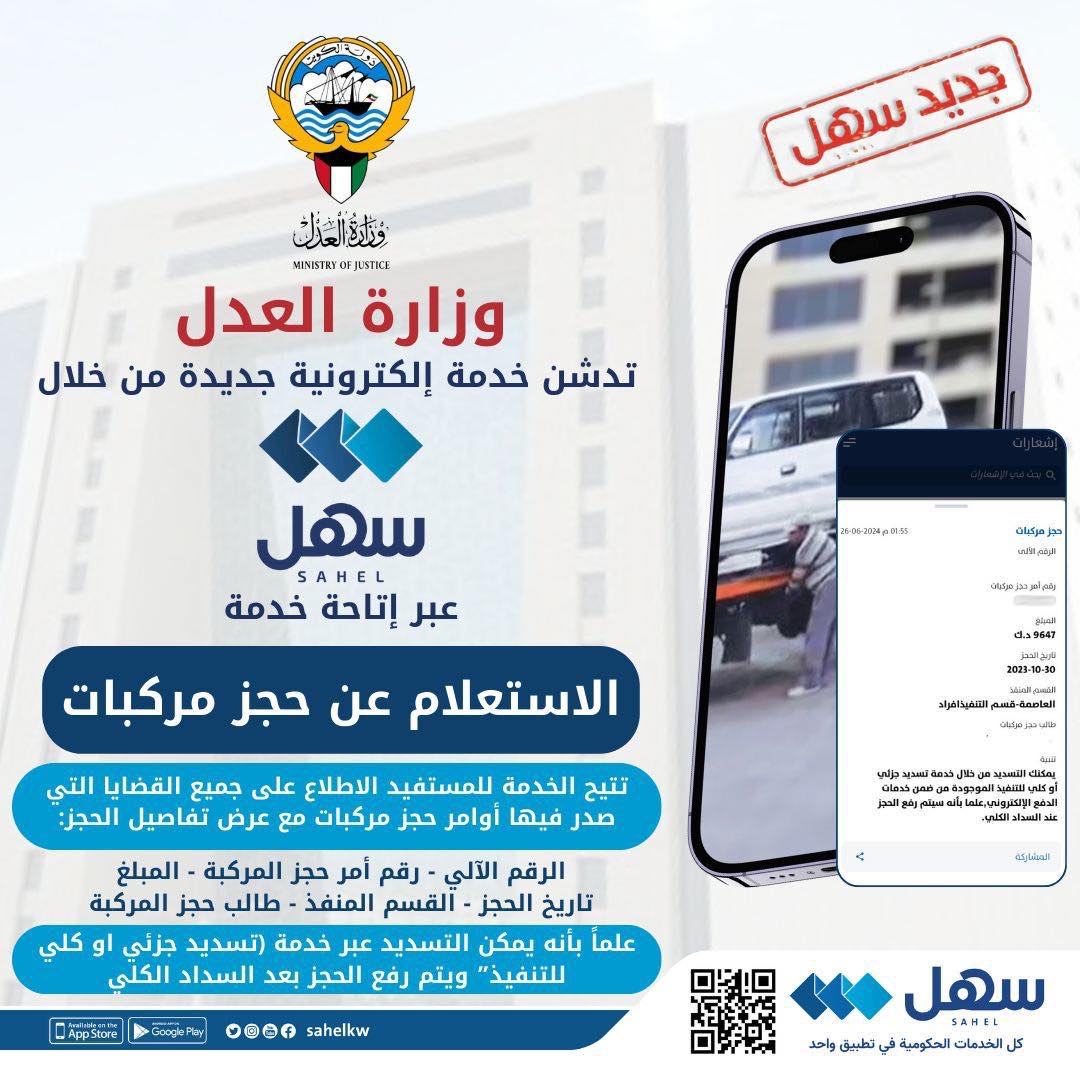 أطلقت وزارةالعدل في الكويت خدمة جديدة هي (الاستعلام عن حجز مركبات) عبر تطبيق سهل