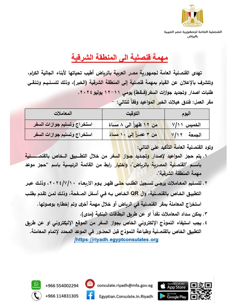 اعلنت القنصلية العامة لمصر في الرياض القيام بمهمة قنصلية إلى المنطقة الشرقية “الخبر” وذلك لتسليم وتلقي اصدار تجديد جوازات السفر يومي ١١ – ١٢ يوليو ٢٠٢٤ في مقر العمل بفندق هيلات الخبر وفقًا للمواعيد المرفقة في الجدول الآتي.