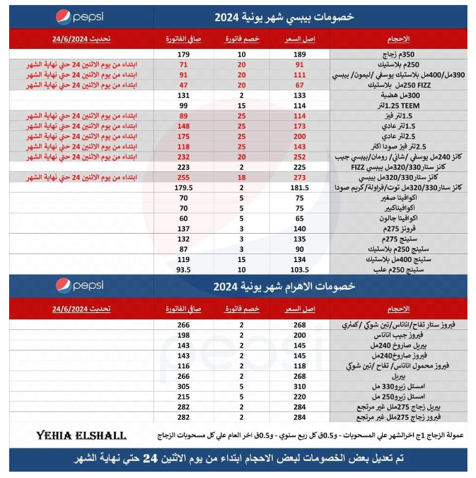ومنحت شركة بيبسي مصر التجار خصومات جديدة بنحو 25 جنيها على عبوات اللتر ونصف و2.5 لتر.