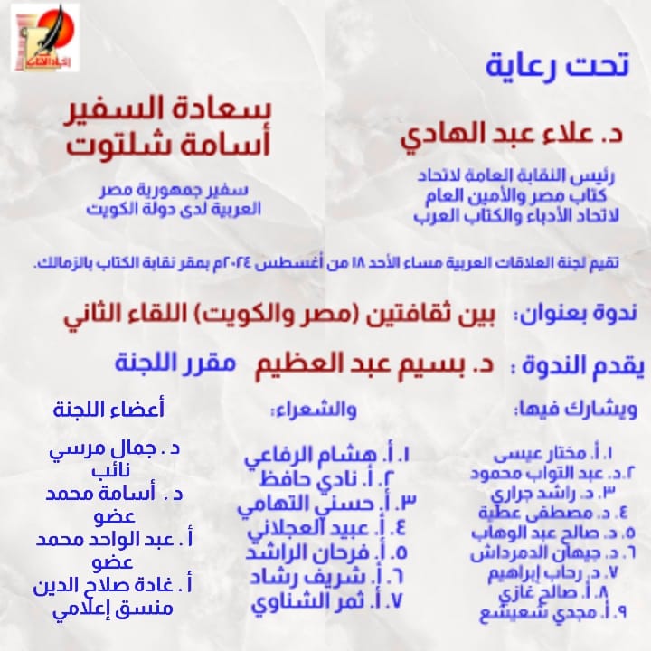 تحت رعاية السفير أسامة شلتوت، سفير مصر في الكويت، والدكتور علاء عبدالهادي، رئيس النقابة العامة لاتحاد كتاب مصر والأمين العام لاتحاد الأدباء والكتاب العرب، تقيم لجنة العلاقات العربية مساء اليوم الأحد 18 أغسطس 2024 بمقر نقابة الكتاب، ندوة بعنوان : بين ثفافتين (مصر والكويت) اللقاء الثاني