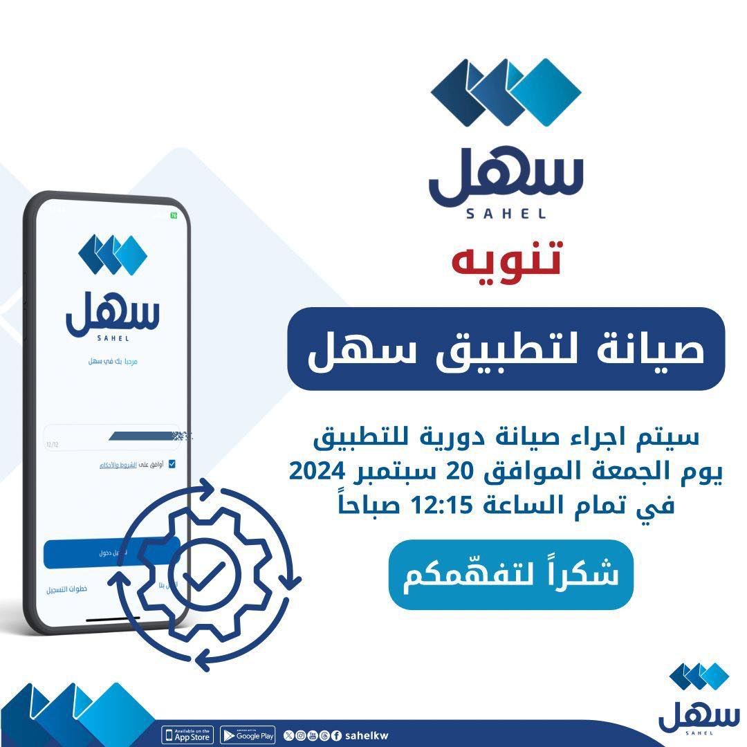 تطبيق سهل: سعياً لتطوير إمكانيات #سهل، نسترعي عناية المستخدمين الكرام إلى أنه في إطار سعينا لتطوير إمكانيات تطبيق سهل، سيتم إجراء صيانة دورية للتطبيق يوم الجمعة الموافق 20/9/2024، ابتداءً من الساعة 12:15 صباحاً، ونشكر لكم تفهمكم.