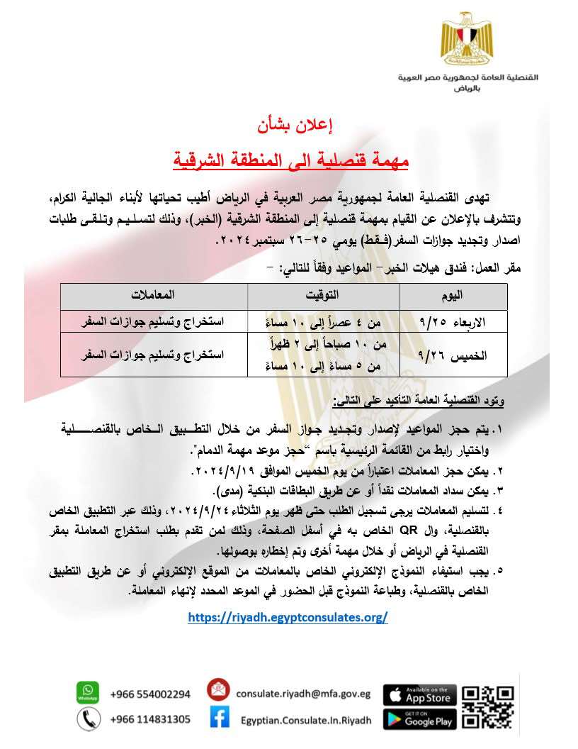 قنصلية مصر في الرياض تعلن عن مهمة قنصلية إلى المنطقة الشرقية (الخبر)