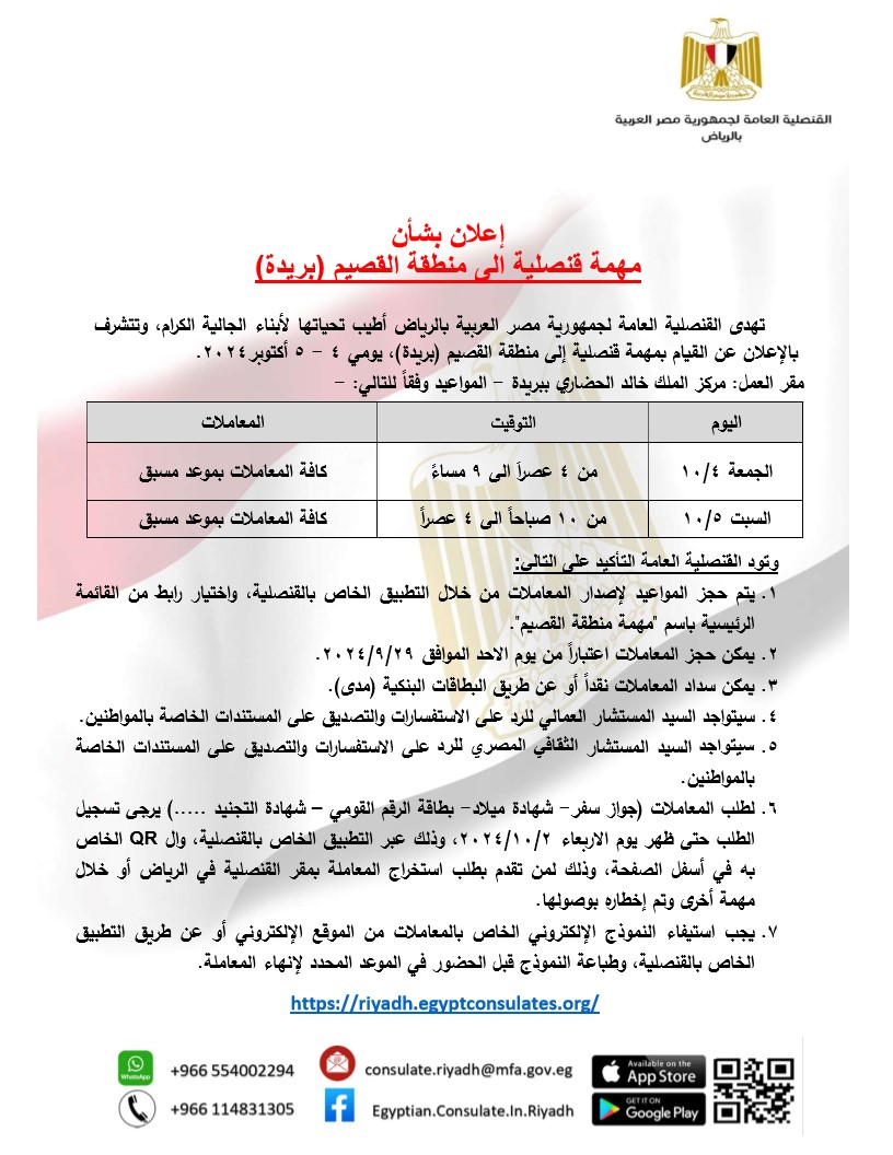 أعلنت القنصلية العامة لجمهورية مصر العربية بالرياض عن القيام بمهمة قنصلية إلى منطقة القصيم (بريدة) يومي 4-5 أكتوبر 2025.