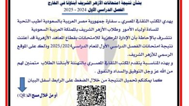 بشأن نتيجة امتحانات الأزهر الشريف أبناؤنا في الخارج، الفصل الدراسي الأول 2024 – 2025. يهدي المكتب الثقافي المصري ــــ سفارة جمهورية…