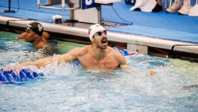 ضامن البطل المصري عبد الرحمن سامح مع القضية الفلسطينية، عقب الفوز بالميدالية الذهبية في كأس العالم للسباحة باليونان، أمس. قال…